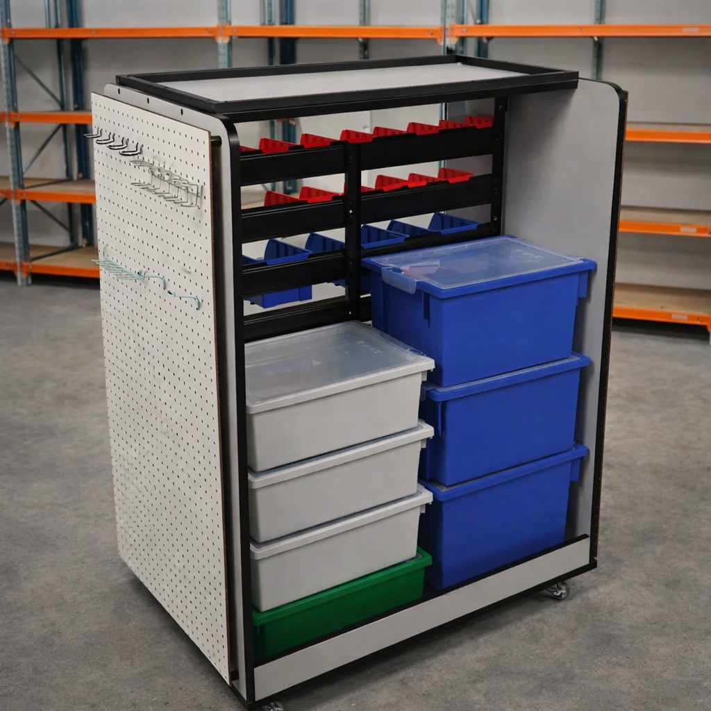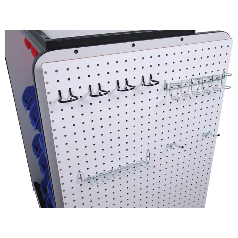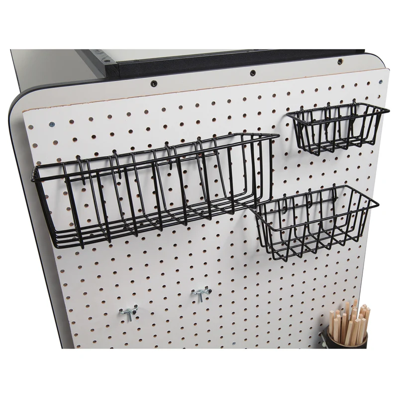There is no better way to keep your makerspace organized than the Pitsco Maker Space® Cart. The cart sits on four wheels and comes with nine small bins and 12 medium bins that fit on racks. Another part of the cart can fit large bins stacked on top of each other. It has pegboard lining the sides of the cart so racks and extra hangers can be placed for more storage. Assembly required.